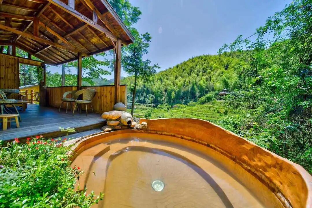 泡上一会,疲惫感瞬间消散,静坐其中,赏园林景观,蒸腾的水雾弥漫周围,给人以舒适之感。